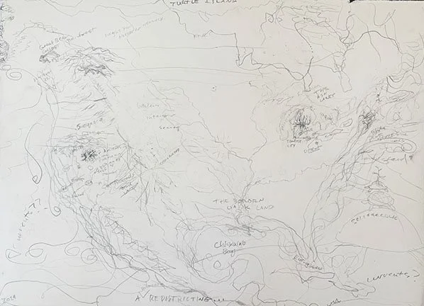 Below is an incomplete drawing of what I hope will one day be a North American ogham comprised of trees native to this continent. The old Celtic Ogham was built on the sacred tree lore of the druids whose ceremonies were often secretly conducted in sacred groves. This underscores an important point about cosmology: place. Cosmologies must be rooted in the specific geography from which they arise. Any North American tree ogham worth its salt will be based on local trees. Hence my pilgrimages to far out spots on this continent. The drawing below sketches in a few of the sites I’ve visited. As you can see, there’s plenty of room for more…